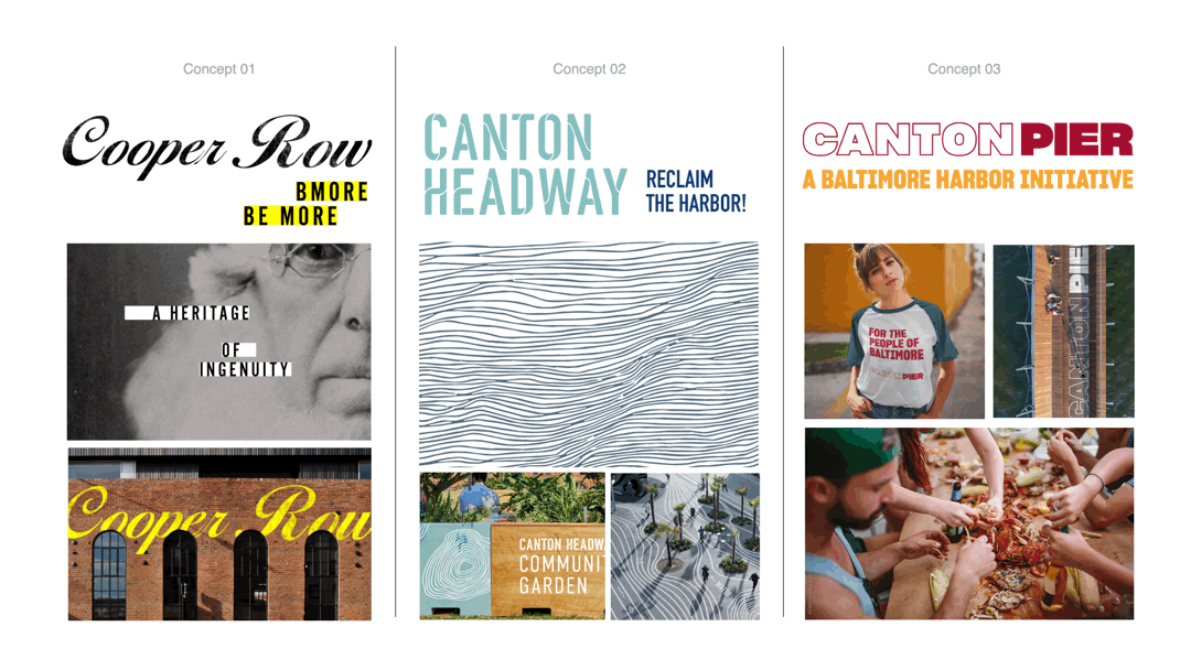 As the pier and its development are the primary drivers for the brand strategy for this concept, the brand identity should focus primarily on defining the pier as a destination. Pier-first also means a primary investment in the people of Canton the brand favors a focus on leisure and community interaction as opposed to commerce and industry.